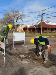 Se están realizando trabajos de bacheo en la intersección de Av. Rivadavia y calle Corrientes.