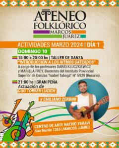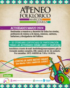 La Secretaría de Cultura y Deporte de la Municipalidad de Marcos Juárez dio a conocer la programación del ATENEO en la previa del Festival Provincial de Folklore 2024.