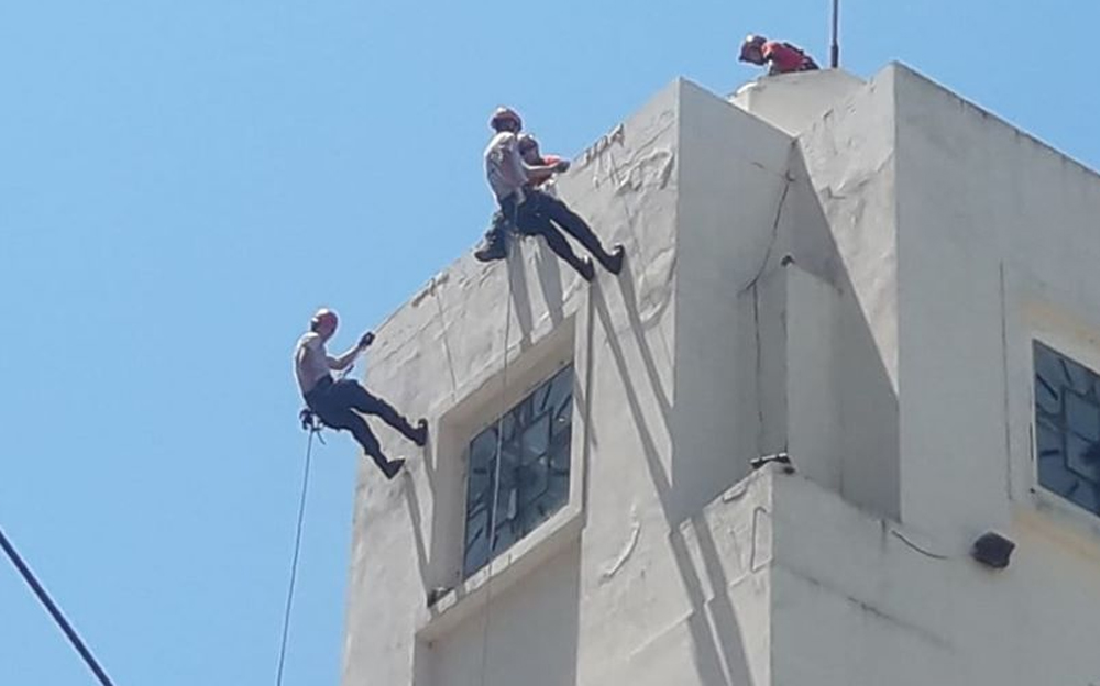 En un momento de la actividad que giró en tres temas importantes como salvamento, rastreo y materiales peligrosos, con demostraciones de evacuaciones en edificios de altura., estuvo presente el intendente Carlos Briner. Una de las demostraciones se hizo desde la torre principal del edificio municipal.