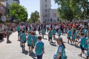Tras el izamiento de las banderas Argentina, de la Provincia y Bell Ville, se desarrolló el acto principal sobre calle Córdoba y en presencia de las fuerzas de seguridad y de numerosas banderas de establecimientos educativos e instituciones del medio.