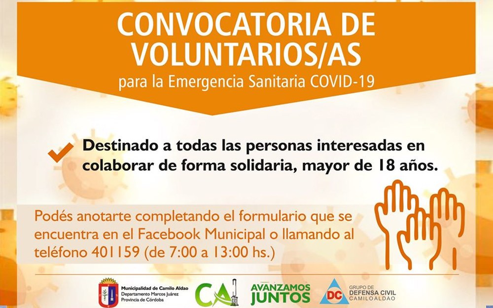 Ante la Emergencia Sanitaria COVID-19 que se vive en la localidad, la Municipalidad de Camilo Aldao convoca a voluntarios/As para diversas tareas.
