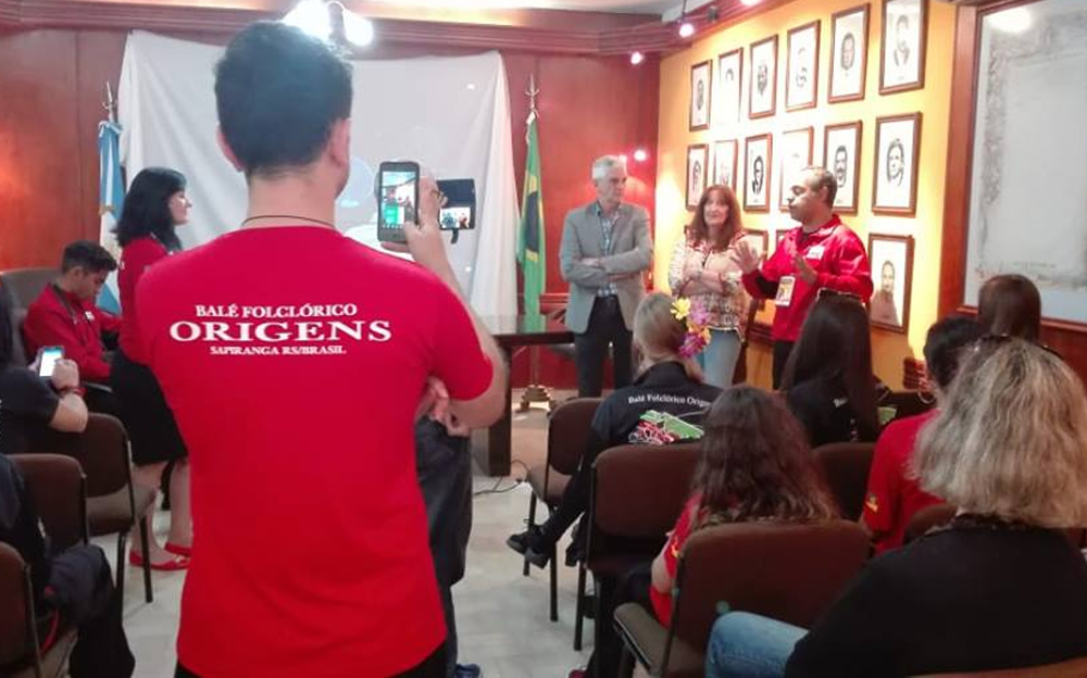 La delegación fue recibida por el intendente municipal Carlos Carignano en el palacio municipal donde se compartió un momento de camaradería e intercambio cultural.