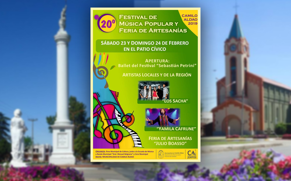 Camilo Aldao: Gran Fiesta Popular el mirador 4 febrero, 2019Triple Media El área cultural de la Municipalidad de Camilo Aldao te invita a participar del 20º Festival de Música Popular y Feria de Artesanías – Camilo Aldao 2019. Día y Lugar: Sábado 23 y domingo 24 de febrero En el Patio Cívico ¡¡NO TE LO PODÉS PERDER!!