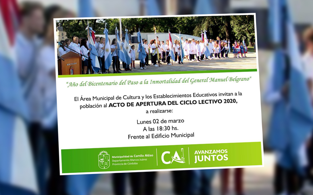 El próximo lunes 2 de marzo a las 18:30 hs. se realizará el acto de apertura del Ciclo Lectivo 2020 frente al Edificio Municipal.