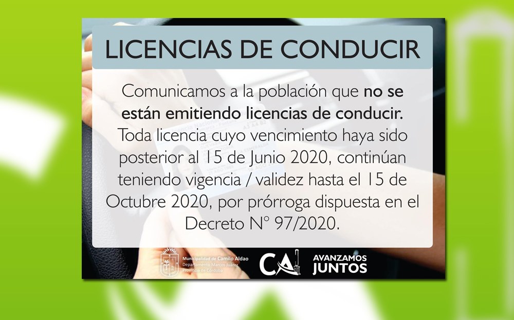 Camilo Aldao: Licencias de Conducir noticias 6 octubre, 2020Triple Media La Municipalidad de Camilo Aldao informa que se prorroga la vigencia de licencias de conducir. En caso de necesitar dicho Decreto, comunicarse al número de urgencia habilitado para esta semana: (03468) 15519568 disponible de 8:00 a 12:00 hs.