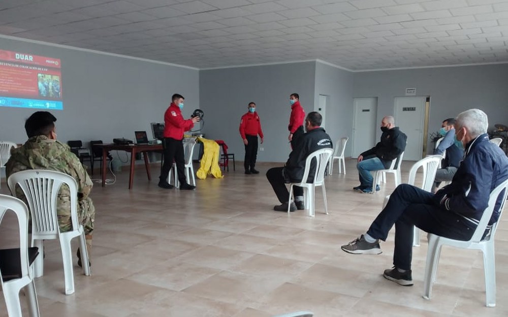 Se realizó un encuentro en el Salón de la Banda Municipal (espacio donde funciona el COE Local), donde estuvieron personas del ejército (integrantes del COE Regional), personal de Bomberos y Policía del grupo DUAR de la provincia, dando capacitación sobre medidas de bioseguridad.