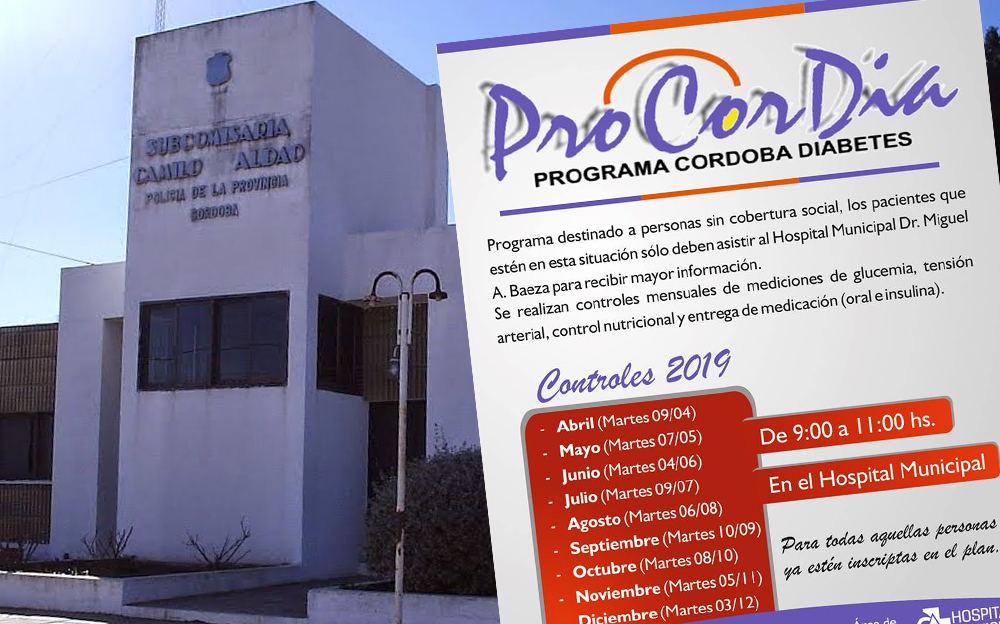 La municipalidad de Camilo Aldao comunica las fechas en las que pueden realizarse los controles 2019 del PROCORDIA (Programa Córdoba Diabetes) que se realizan en el Hospital Municipal.