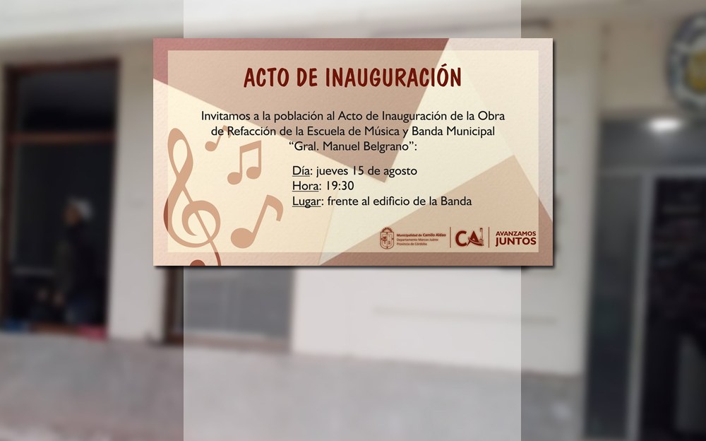 La Municipalidad de Camilo Aldao invita al Acto de inauguración de la Obra de Refacción en Escuela de Música y Banda Municipal “Gral. Manuel Belgrano”