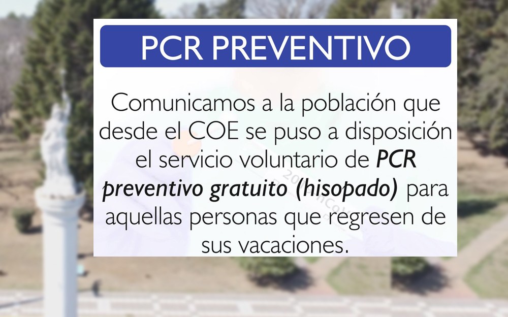 La Municipalidad de Camilo Aldao informa que se encuentra disponible el PCR PREVENTIVO GRATUITO (hisopado) para personas que regresen de sus vacaciones.