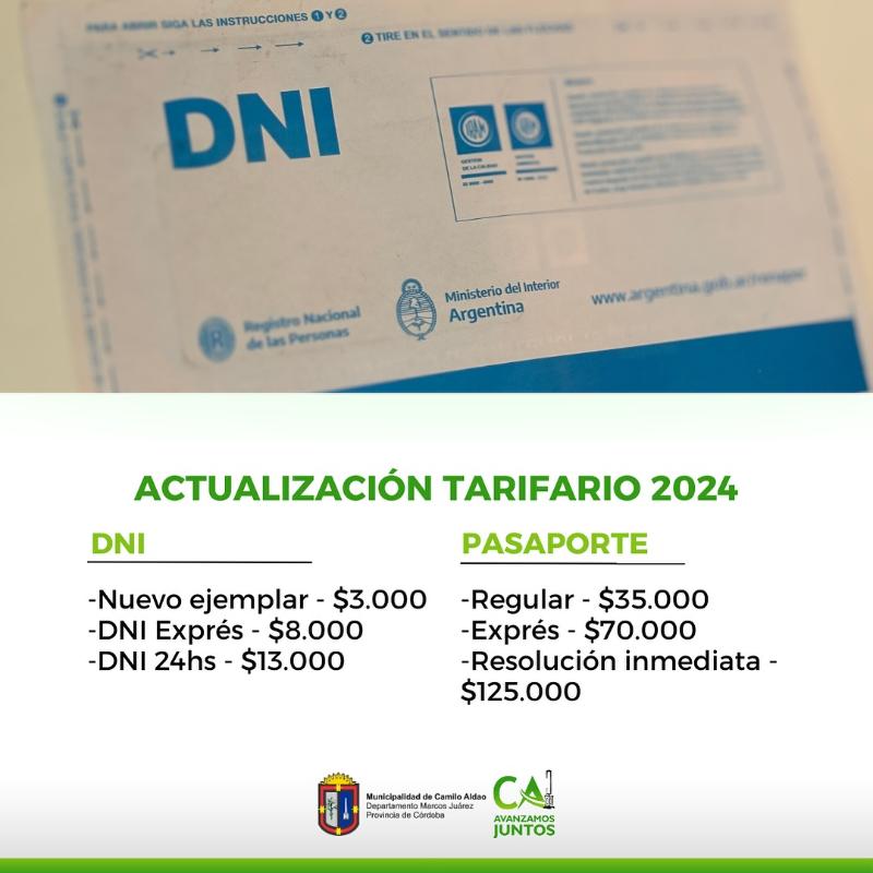 Camilo Aldao: Tarifario para Documentos y Pasaporte noticias 15 enero, 2024Triple Media La Municipalidad de Camilo Aldao dio a conocer el tarifario para la obtención o renovación de documentos y pasaportes para este 2024.