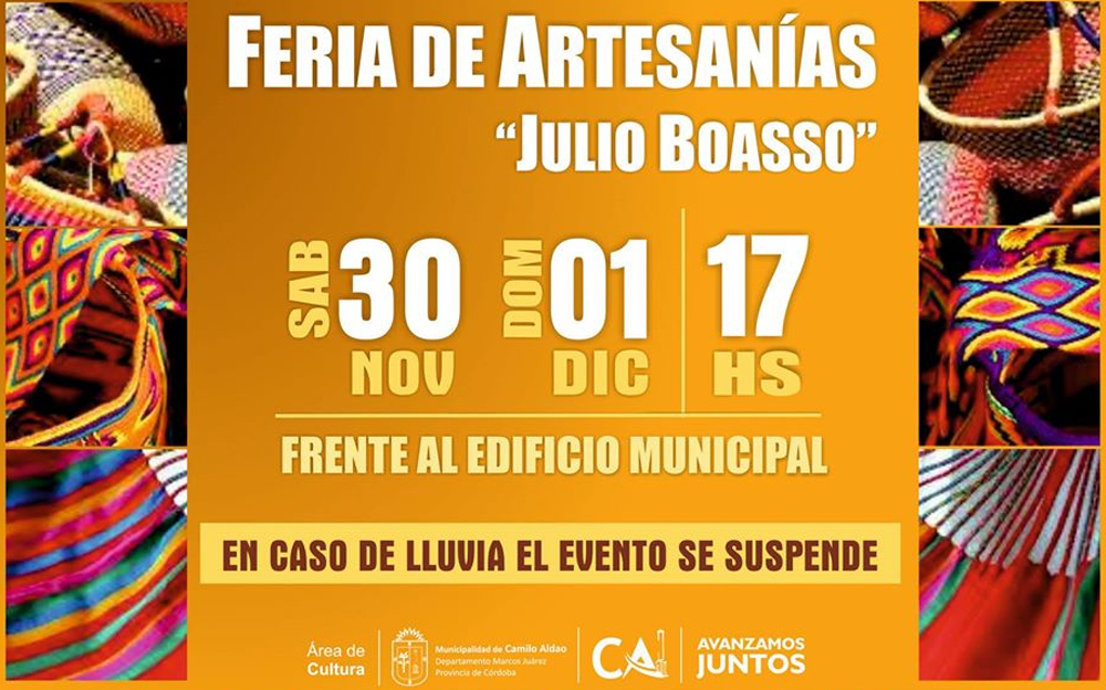 El sábado 30 de noviembre y domingo 01 de diciembre, frente al Edificio Municipal de Camilo Aldao, tendrá lugar la FERIA DE ARTESANÍAS “JULIO BOASSO”.