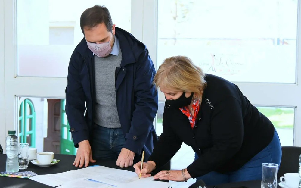 La intendenta Sandra Dal Bò junto al, Martin R Gill, firmaron un convenio por 10 cuadras más de adoquinado del Programa ARGENTINA HACE.
