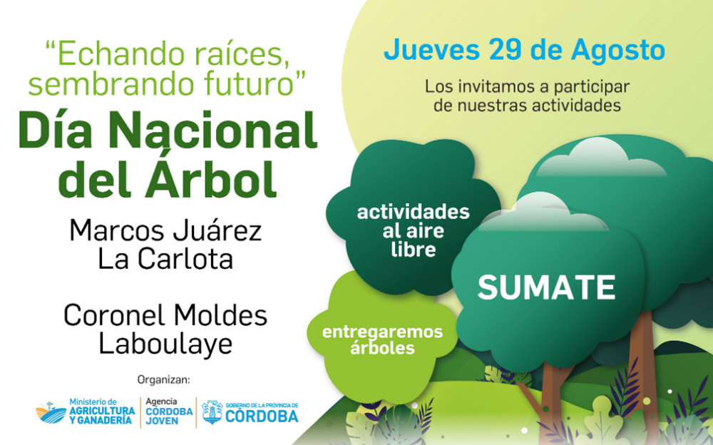 Bajo el lema “Día del Árbol: Raíces para el futuro”, el Ministerio de Agricultura y Ganadería programó una jornada de trabajo simultánea en cuatro localidad del interior cordobés. Marcos Juárez, La Carlota, Laboulaye y Coronel Moldes, serán el próximo 29 de agosto sedes de los festejos.