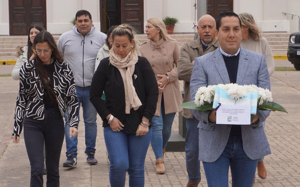 En horas del mediodía el Intendente Agustín González acompañado por el cura párroco Carlos Licari y Autoridades Municipales realizaron la ofrenda floral al pie del Busto del Gral. José de San Martín, en la plaza que honra su nombre.