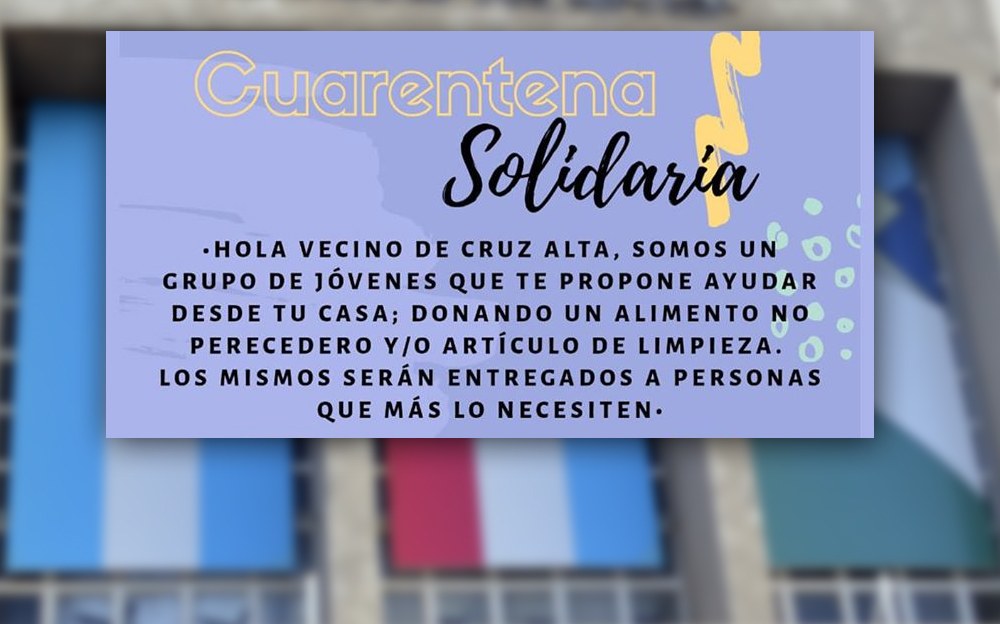 Cruz Alta: Cuarentena SOLIDARIA noticias 22 abril, 2020Triple Media El próximo 25 y 26 de abril se realiza en Cruz Alta la Campaña “Cuarentena SOLIDARIA”. “Ayudanos a ayudar!”