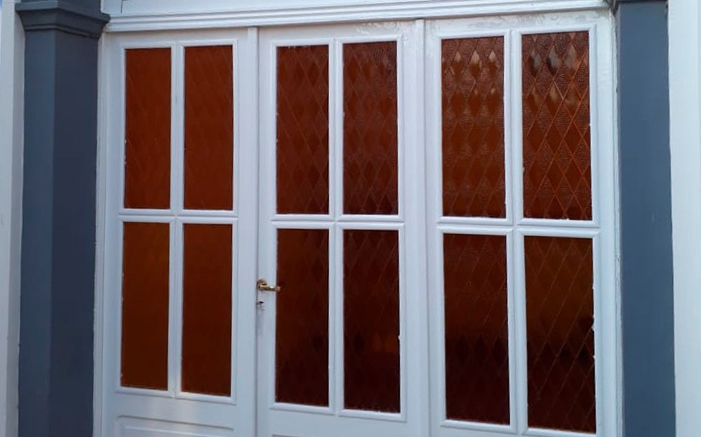 Se realizaron tareas de lijado, masillado y pintura final de puertas vidriadas y marco de madera original. Posteriormente se procedió al montaje de hojas en el lugar, el recambio de picaporte, cerradura y bisagras.