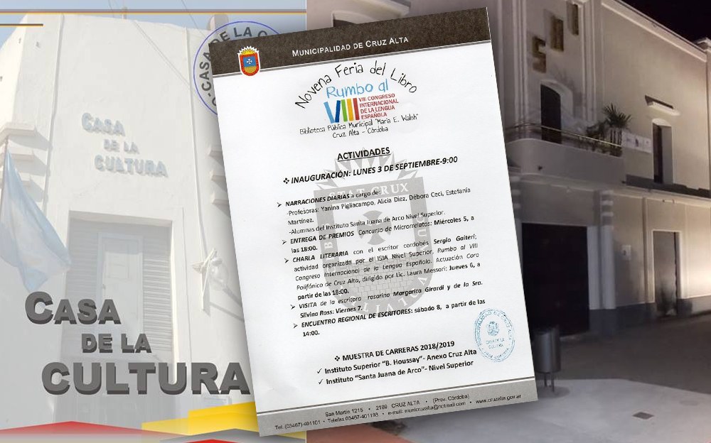 La Municipalidad de Cruz Alta, a través de la Dirección de Cultura y Educación, invita a la población cruzalteña a la NOVENA FERIA DEL LIBRO organizada por la Biblioteca Pública Municipal “María E. Walsh”. La misma se realizará en la Casa de la Historia y la Cultura del Bicentenario, desde el lunes 3 al sábado 8 de septiembre.