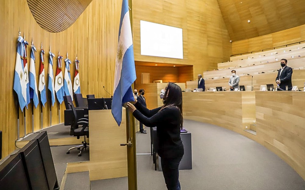 Acompañando el acto que transcurría desde el Congreso de la Nación, la diputada Soher El Sukaria izó el pabellón nacional en el Palacio Legislativo local.