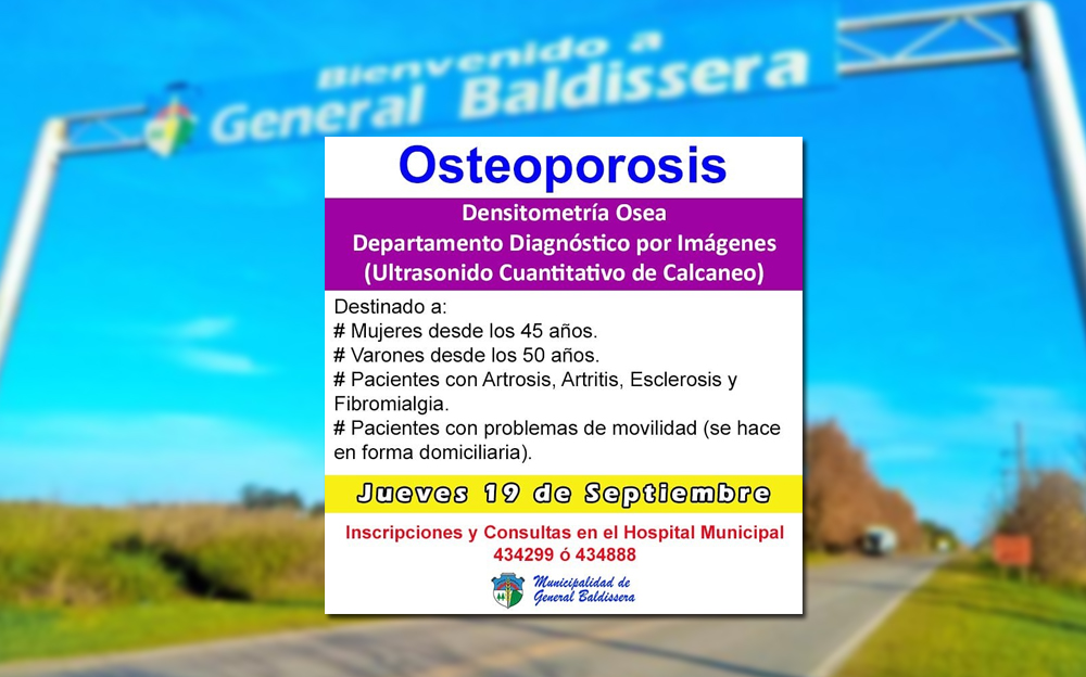 General Baldissera: Campaña de Salud noticias 23 agosto, 2019Triple Media La municipalidad de General Baldissera continúa con las campañas de salud en el Hospital Municipal. El jueves 19 de septiembre se realizarán estudios específicos de Densitometría Ósea.