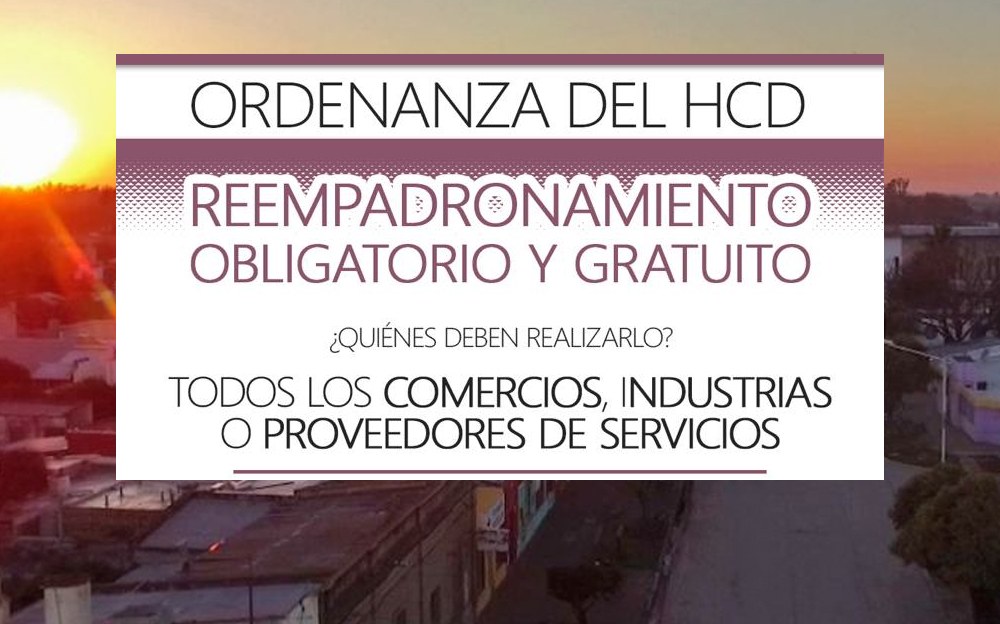 La Municipalidad de General Roca informa la vigencia del Reempadronamiento Obligatorio Y Gratuito para todos los comercios, industrias y proveedores de servicios de la localidad.