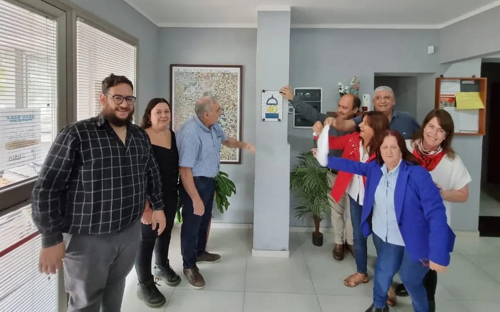 El intendente Juan Pablo Vassia junto a Daniel Soliani y la artista mosaiquista Micaela Cinalli, en presencia de ciudadanos y personal municipal, realizaron el descubrimiento de una obra artística conmemorativa.