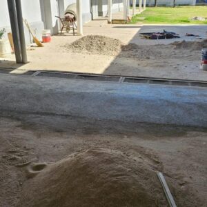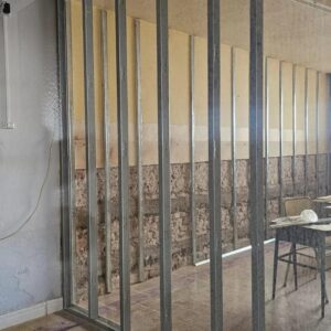 En la Escuela Paula A. de Sarmiento, la Municipalidad de Idiazábal construye un divisorio para transformar el Taller de Usos Múltiples en dos aulas.