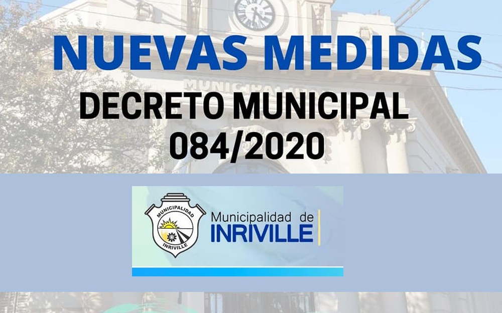 Inriville: Nuevas Medidas noticias 3 agosto, 2020Triple Media Estas son las nuevas medidas adoptadas por el ejecutivo municipal que se encuentra a la espera de la Resolución de la Provincia de Córdoba.