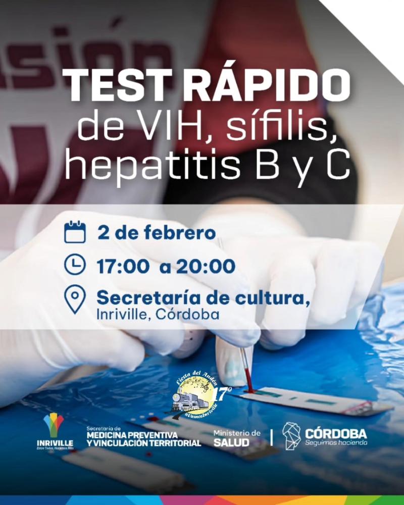 La Municipalidad de Inriville invita a la comunidad a sumarse al Test Rápido de VIH, Sífilis, Hepatitis B y C que estarán disponibles el domingo 02 de Febrero en el marco de la Fiesta del Andén.