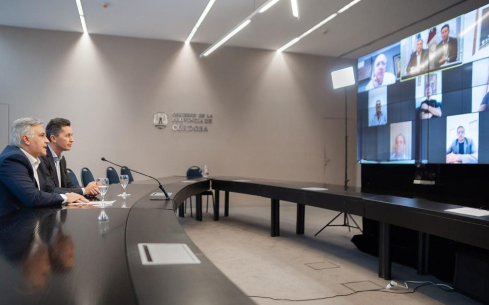 En el zoom con los presidentes de los Foros de Intendentes el gobernador estuvo acompañado por el ministro de Gobierno Manuel Calvo. Del otro lado de la pantalla participaron del encuentro virtual los intendentes Juan Manuel Llamosas (Hacemos Unidos por Córdoba), Rubén Dagum (UCR), Sebastián Demarchi (Vecinalismo), Adrián Radice (La Libertad Avanza), Esteban Avilés (Vecinalismo) y Guillermo Ristorto (Comupro), quienes representan a la totalidad de los intendentes y jefes comunales de la provincia.