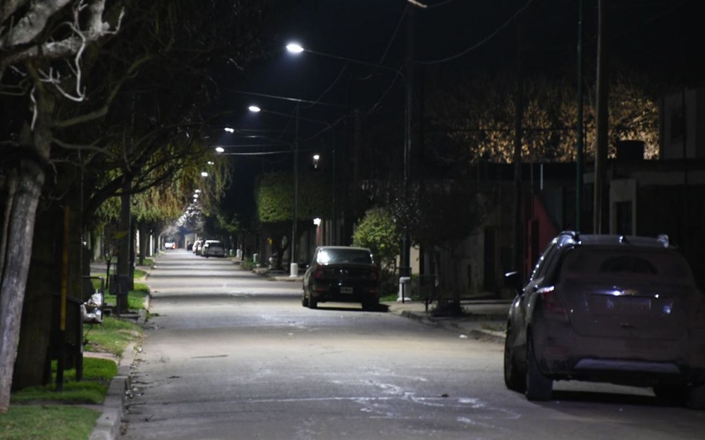 Sobre calle Laprida, entre Almirante Brown y Entre Ríos, la Municipalidad de Leones renovó toda el alumbrado público con artefactos led de 150 W que garantizan mayor ahorro energético.