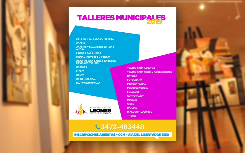 Leones: Talleres Municipales 2019 noticias 26 febrero, 2019Triple Media Más de 25 propuestas, para todas las edades, se presentan en el Centro Cultural Municipal de Leones. Todo listo para participar del ciclo 2019. Inscripciones abiertas