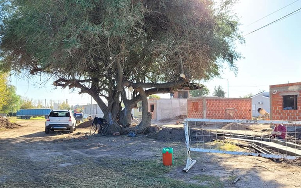 “Ya estaba allí, antes que llegáramos con las máquinas y el cemento. Es un añoso árbol que creció en el campito de “Juan Ciani”, testigo de picaditos de fútbol e interminables partidos de bochas domingueros. Hasta fue el primer lugar donde celebramos la Fiesta de los Santos Patronos.