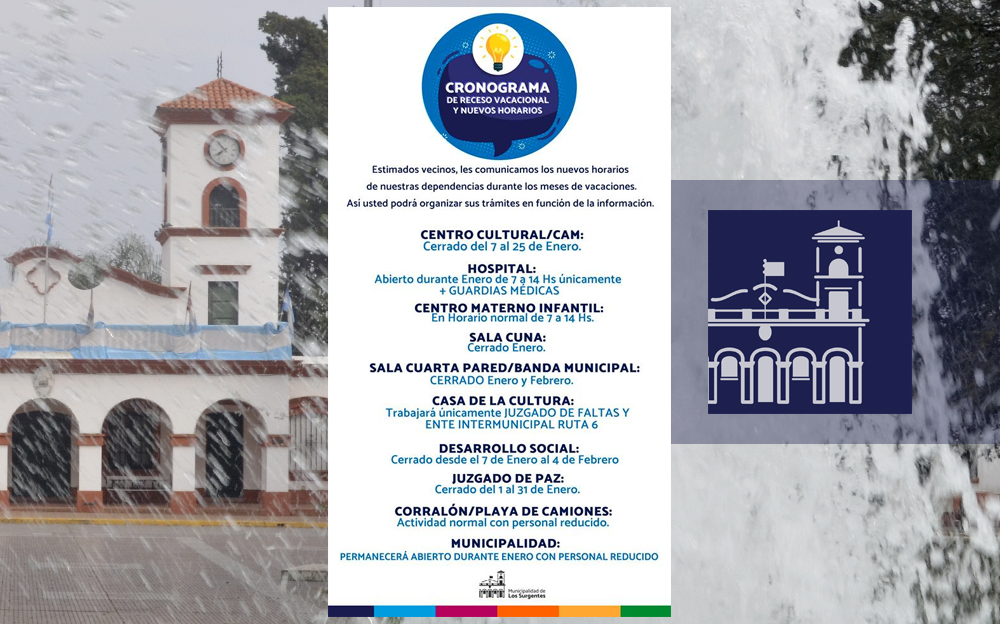 La municipalidad de Los Surgentes mantiene guardias activa en la atención al vecino durante el receso vacacional. Se dio a conocer los horarios de atención y consulta para las diferentes áreas del gobierno municipal que lleva adelante Paula Córdoba.
