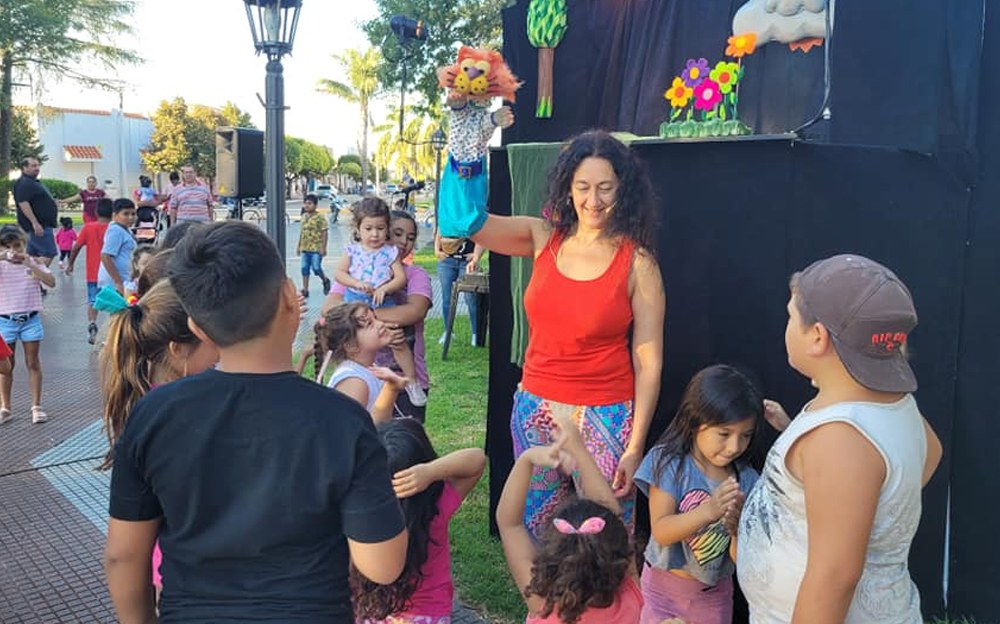 La plaza central se llenó de infancias participativas. Los títeres ” Fresca viruta” del Instituto Nacional de Teatro ofrecieron “Poroto, el semillo”.