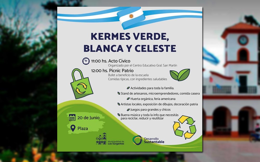 Este jueves la plaza central de Los Surgentes se vestirá con los colores patrios y tendrá además una serie de actividades ecológicas para cerrar el mes del Medio Ambiente.
