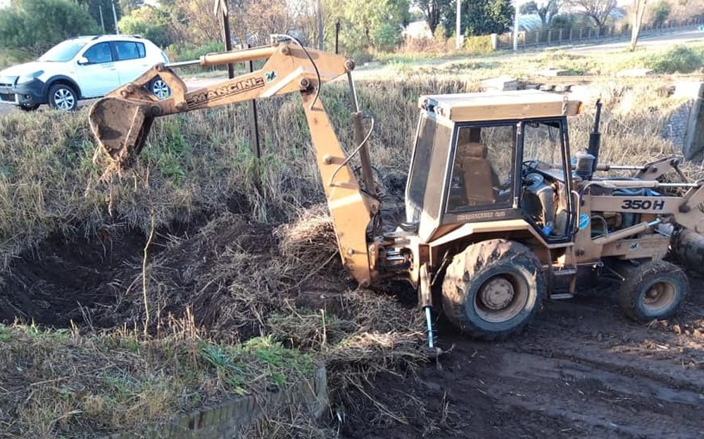 Avanzan los trabajos de limpieza y desmalezamiento en canales de desagüe de la zona este, cruzando las vías, donde la retropala acciona en las inmediaciones del viejo puente ferroviario.