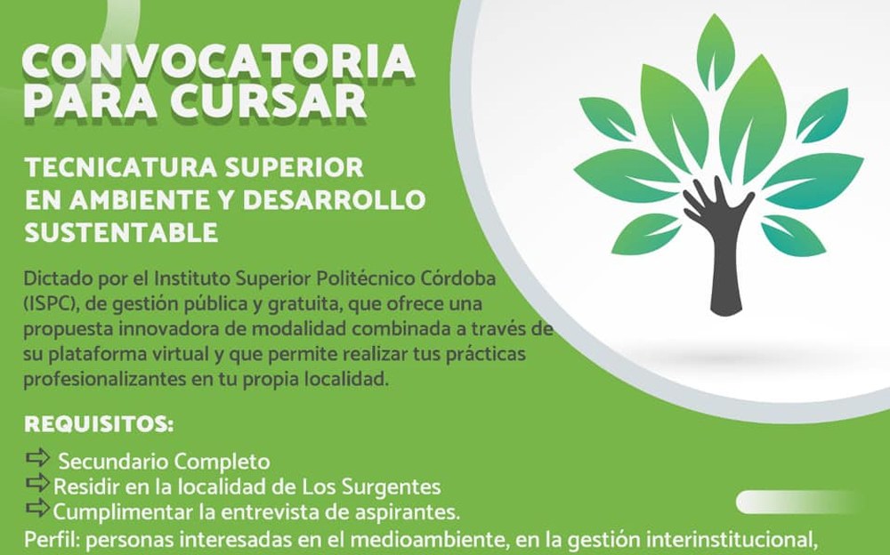 La Municipalidad de Los Surgentes informa que se da inicio a la Tecnicatura Superior en Ambiente y Desarrollo Sustentable, de manera gratuita y a distancia.