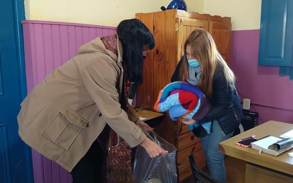 La Prof. Laura Fernández del Instituto Castoldi fue la encargada de recibir cuadraditos de lana realizados en el Hogar Madre Teresa y de distintas vecinas del pueblo que se sumaron y fueron unidos por las tejedoras del Taller Manos Mágicas del Centro Cultural.