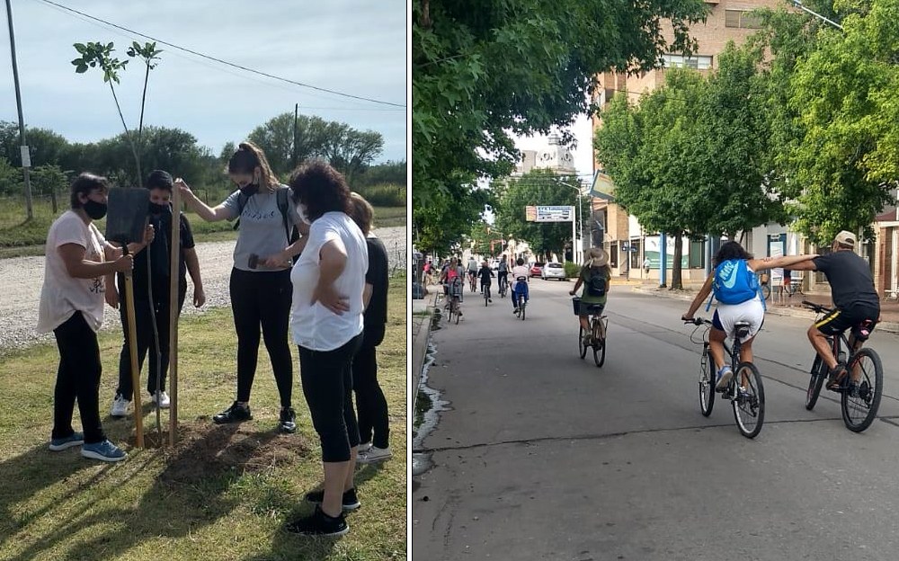 El grupo Voluntarios para la acción climática de Marcos Juárez realizó una bicicleteada con el objetivo de acompañar la forestación de diversos sectores de la ciudad.