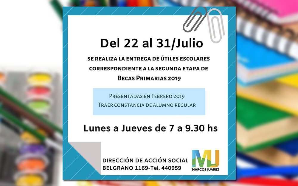 El área de Acción Social de la Municipalidad de Marcos Juárez realizará la entrega de útiles correspondientes a la segunda etapa de las Becas Primarias 2019.