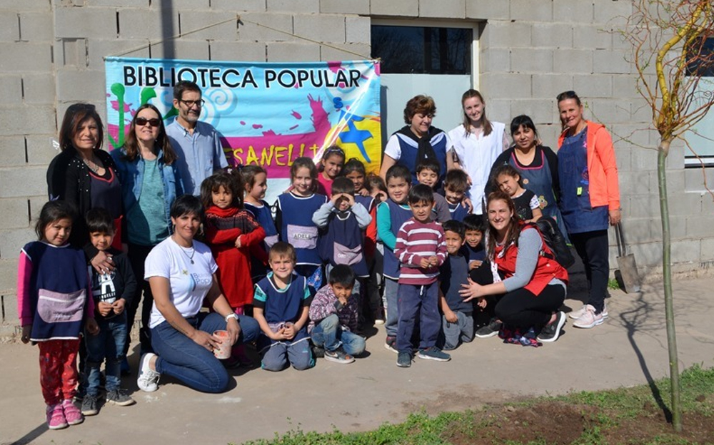 El nuevo edificio de la Biblioteca Popular Lidia Cesanelli cuenta con arbolado propio gracias a las manos cuidadores de los niños y niñas del Jardín Zambruno.