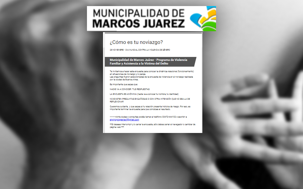 La Municipalidad de Marcos Juárez a través del Programa de Violencia Familiar y Asistencia a la Víctima del Delito te invita a participar de una encuesta para conocer la dinámica relacional (funcionamiento) en situaciones de noviazgo y/o pareja.