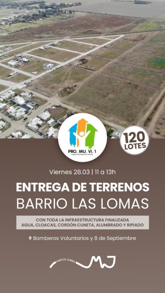 El viernes 28 de marzo, de 11 a 13 h, se realizará la transferencia de 120 lotes del Barrio Las Lomas a sus propietarios. Estos terrenos, correspondientes al Programa Municipal de Vivienda (PRO.MU.VI.), se entregan con todas las obras de infraestructura finalizadas, incluyendo agua, cloacas, terrenos amojonados, cordón cuneta, alumbrado y ripiado.