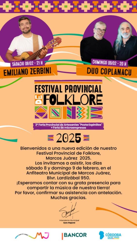 Marcos Juárez: Festival Provincial de Folklore noticias 4 febrero, 2025Triple Media La Municipalidad de Marcos Juárez invita a participar de una nueva edición del Festival Provincial de Folklore. Durante las jornadas se desarrollará la 3ª Feria Provincial de Artesanías “Posta Espinillos” y Feria de Microempresas.