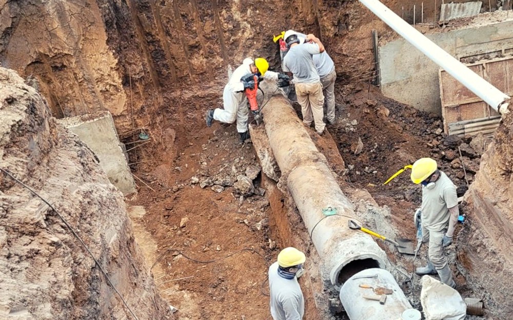 En intersección de calles Paula Albarracin de Sarmiento y Los Constituyentes, la Coyspu realizó el reemplazo de un colector cloacal de 500 mm de diámetro nominal, por un tubo de PVC de 635 mm encamisado con cañería de acero pintado con epoxi, ya que el mismo quedará dentro del canal de desagües pluviales que se está construyendo desde lago Henry Dellarossa hasta avenida Las Colonias.