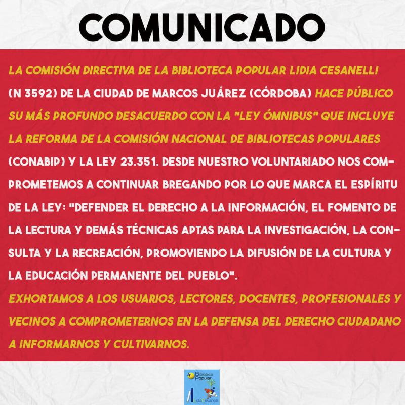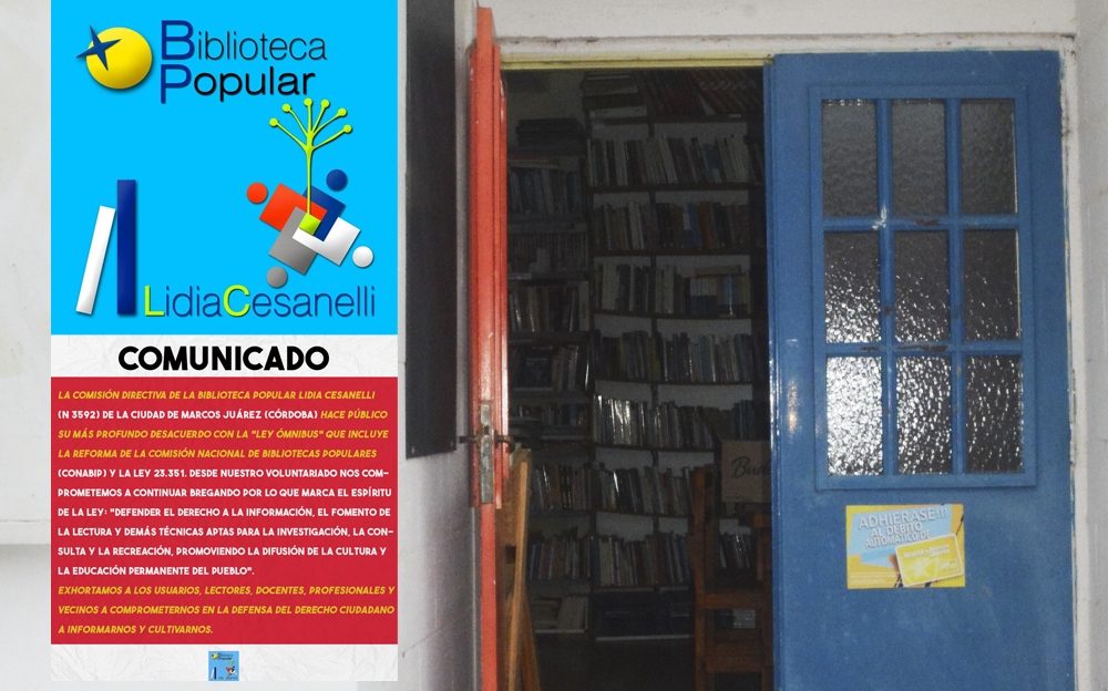 La Biblioteca Popular Lidia Cesanelli difundió un comunicado expresando su postura frente al Decreto de Necesidad y Urgencia del Gobierno Nacional: