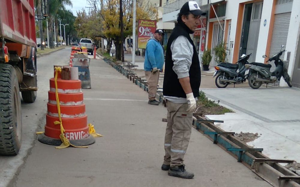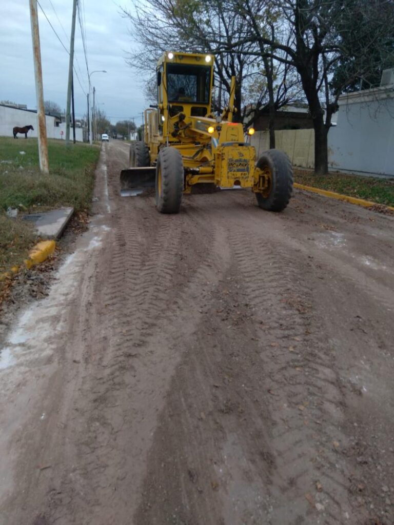 Los equipos de trabajo de la Municipalidad de Marcos Juárez están reparando calles con la motoniveladora en barrio Villa Argentina y bajando la vereda en Los Constituyentes entre Av. Las Colonias y 9 de Julio.