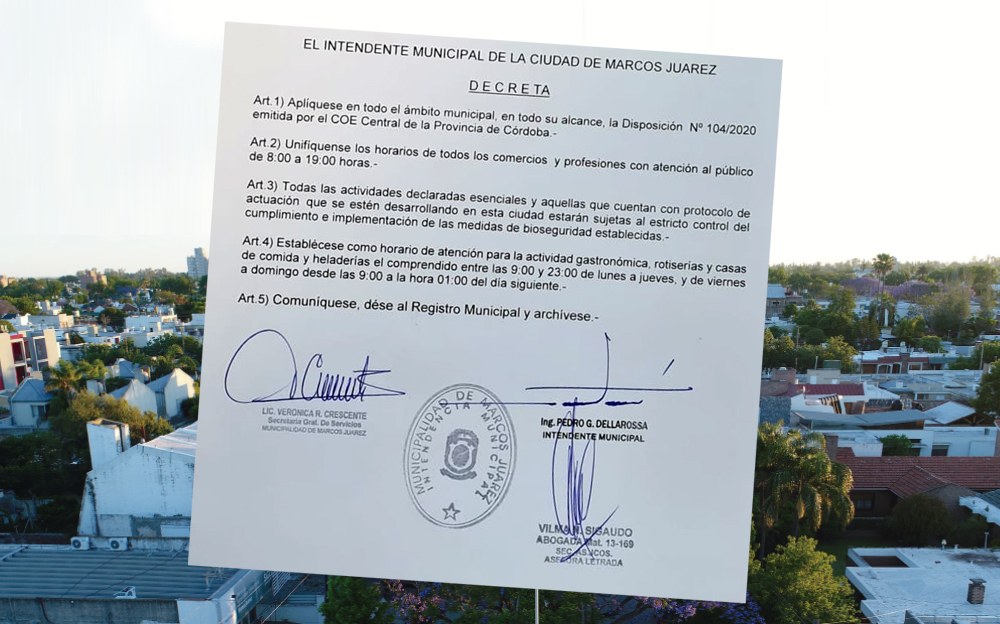 Marcos Juárez: Se extiende el horario comercial noticias 18 agosto, 2020Triple Media La Municipalidad de Marcos Juárez difundió las nuevas disposiciones para la ciudad. A través del decreto firmado por el Intendente Pedro Dellarossa se extiende el horario comercial y atención profesional hasta las 19:00 hs. Importante