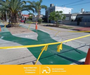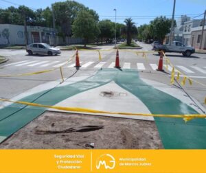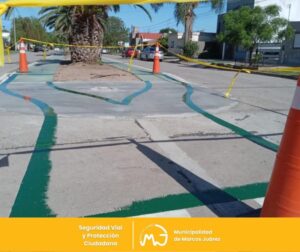 En la Bicisenda se ve el comienzo de la pintura del trazado en calle Sáenz Peña, entre Pedro Lino Funes y Rosario de Santa Fe.