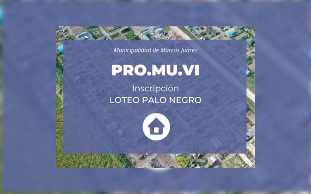 La oficina de PRO.MU.VI de la Municipalidad de Marcos JUárez informa que se encuentra abierta la convocatoria para las inscripciones al sorteo y adjudicación de lotes en el barrio denominado “PALO NEGRO”.